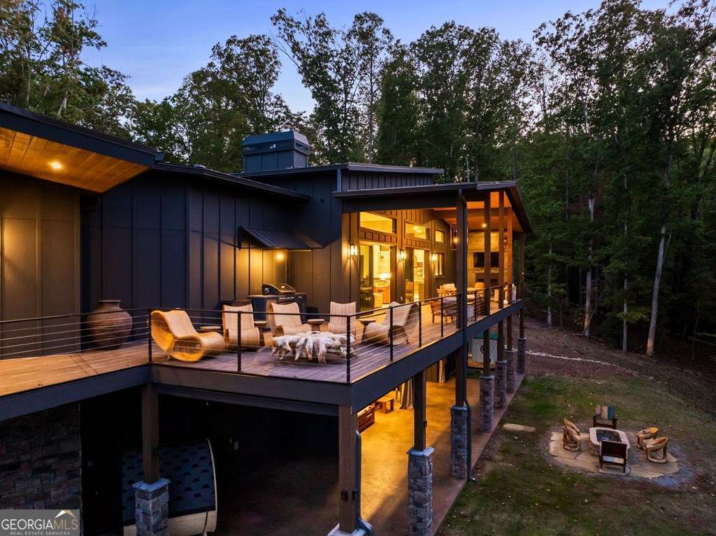 Experience upscale mountain living on 4.17 secluded acres, surrounded by the untouched beauty of protected Blue Ridge forests. Just 5 minutes from Downtown Blue Ridge and less than 1 minute from Lake Blue Ridge, the homeCOs exterior features a porte-cochere entrance and electric vehicle charger. Inside, the fully furnished home includes handpicked, one-of-a-kind pieces included in the sale. The gourmet chefCOs kitchen features Brazilian Sandal Wood quartzite on an 8x8 island, built-in fridge, Ilve 48" gas range, dual dishwashers, and custom imported from Spain Lioher cabinetry. The open-concept living and dining area is framed by 19-foot tounge and groove pine ceilings and anchored by a marble-finished glass gas fireplace. The seamless indoor-outdoor flow leads to an expansive covered deck with 16-foot ceilings, a custom steel fireplace, grill, and multiple seating areas offering stunning long-range views. The primary suite features wooden beams, a private patio with a seating area and fireplace, and a walk-in closet with its own washer/dryer. The spa-like en-suite bath offers a 13x7 shower/tub sanctuary with travertine walls, marble floors, a stone tub, and a floating 13-foot vanity with heated porcelain floors. The lower level is an entertainerCOs haven, complete with a seating area, wet bar and two bedroomsCoone with bunk beds and a washer/dryer, and the other with direct access to the outdoor entertainment area. The outdoor lower level features stained concrete floors, heaters, a jacuzzi spa, barrel sauna, and an oval fire pit surrounded by flagstone seating for cozy gatherings year-round. Immerse yourself in a lifestyle where timeless design and nature coexist effortlessly.